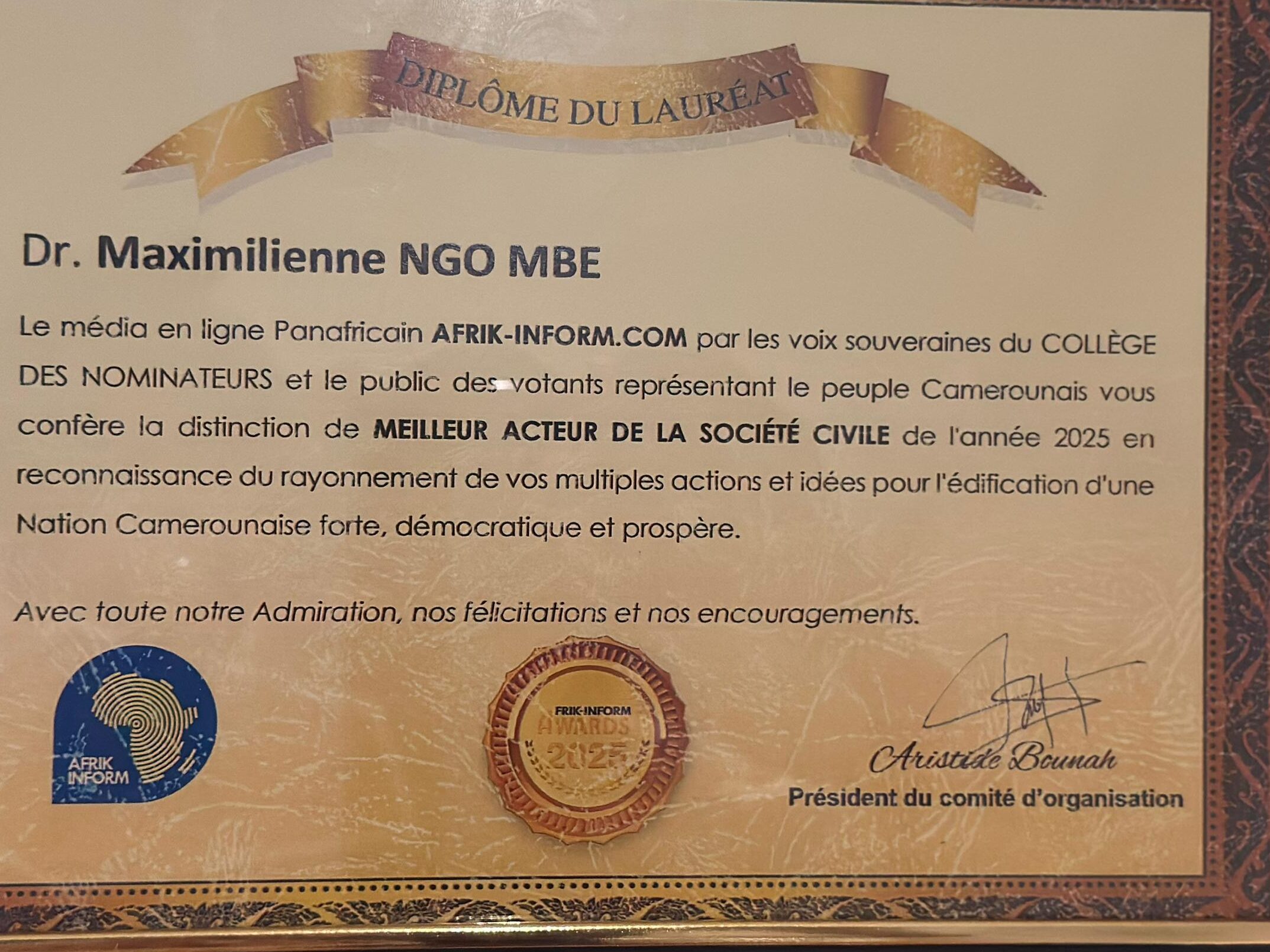 - Leave a Comment on Dr. Maximilienne C. Ngo Mbe, sacrée meilleur acteur de la société civile du Cameroun aux Afrik-inform Awards.